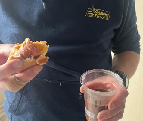 Ondanks de sneeuwval wordt er vandaag op sommige buitenprojecten gewoon doorgewerkt. Afgeschermd of op een galerij, maar met lage temperaturen. Om de mannen een hart onder de riem te steken zijn we langsgegaan met broodjes rookworst en warme chocomel. Dat werd zichtbaar gewaardeerd!#doorwerken #galerij #bikkels #schilderen #rookworst